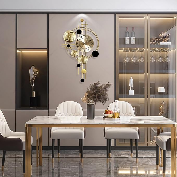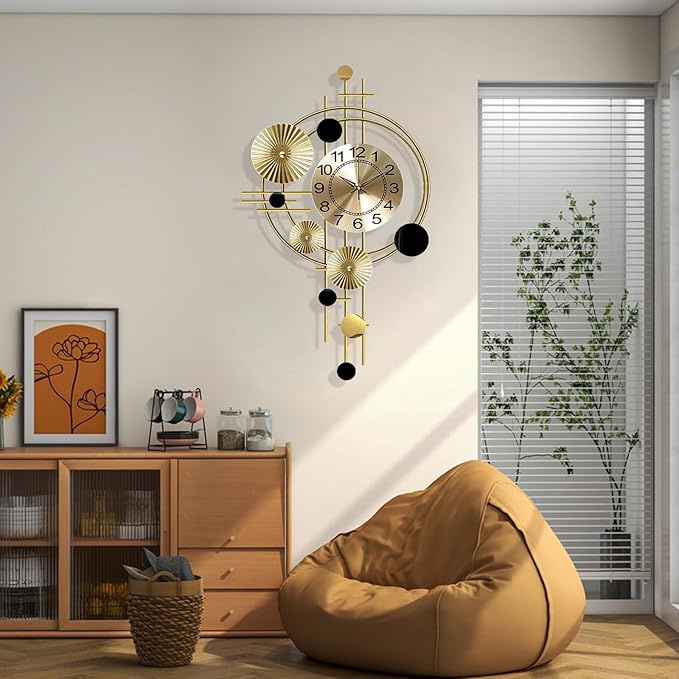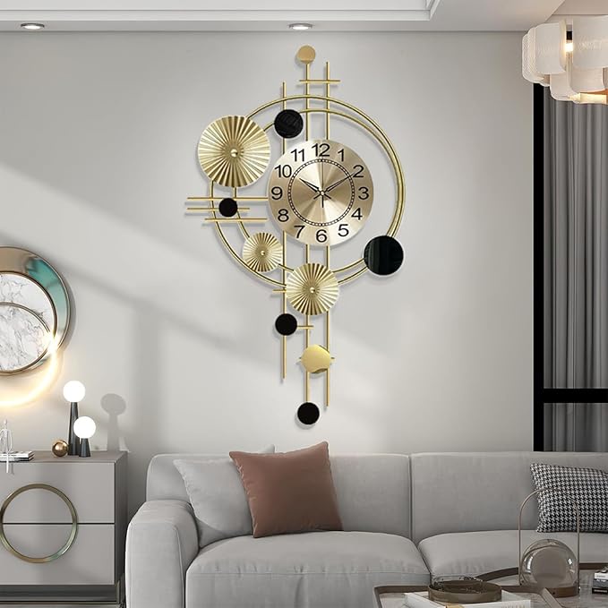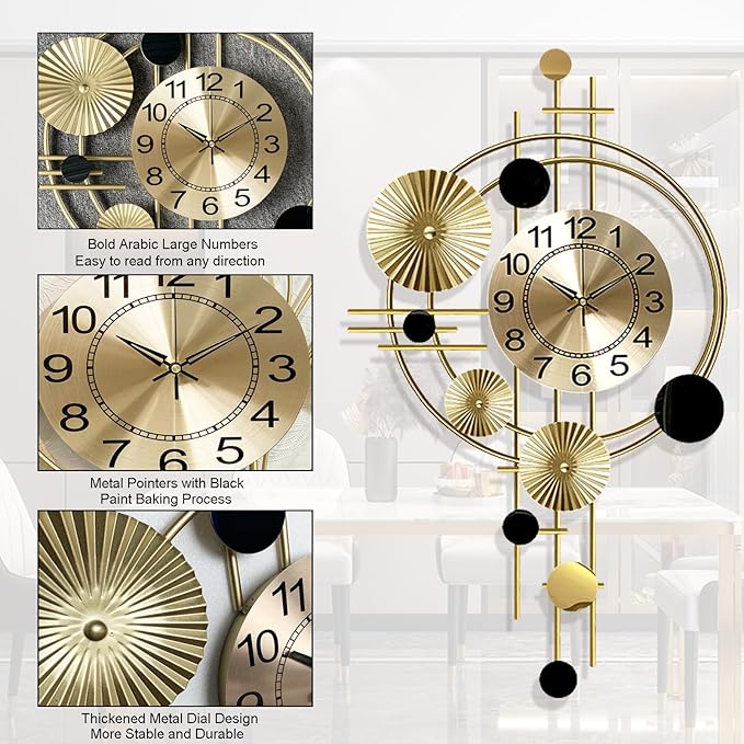 ساعة حائط مزخرفة كبيرة بتصميم شمالي عصري ولمعان معدني جذاب، ليست مجرد ساعة بل قطعة ديكور فنية تضيف فخامة وأناقة لأي مساحة.