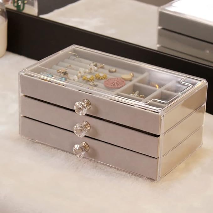 منظم مجوهرات أكريليك شفاف مع 3 أدراج قابلة للتعديل وصواني مخملية لتنظيم وعرض الخواتم والقلائد والأساور بأناقة.