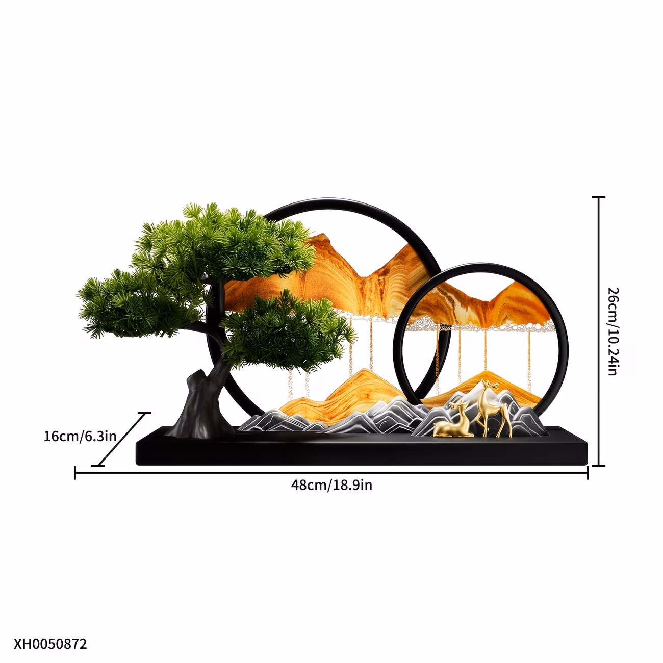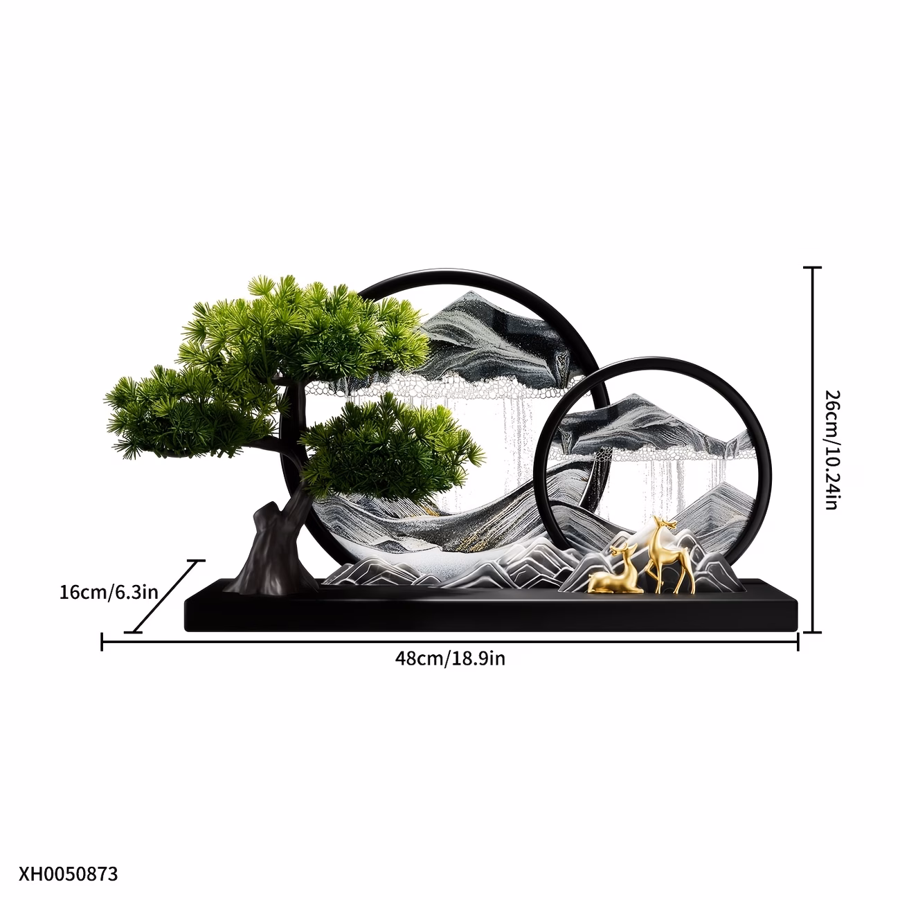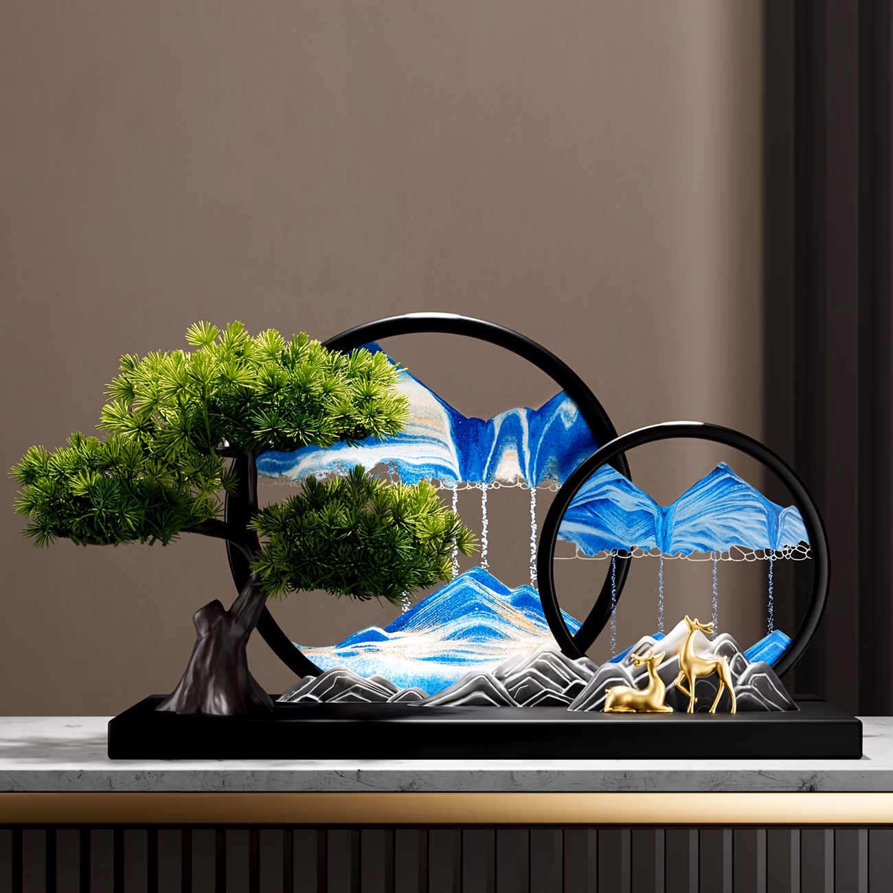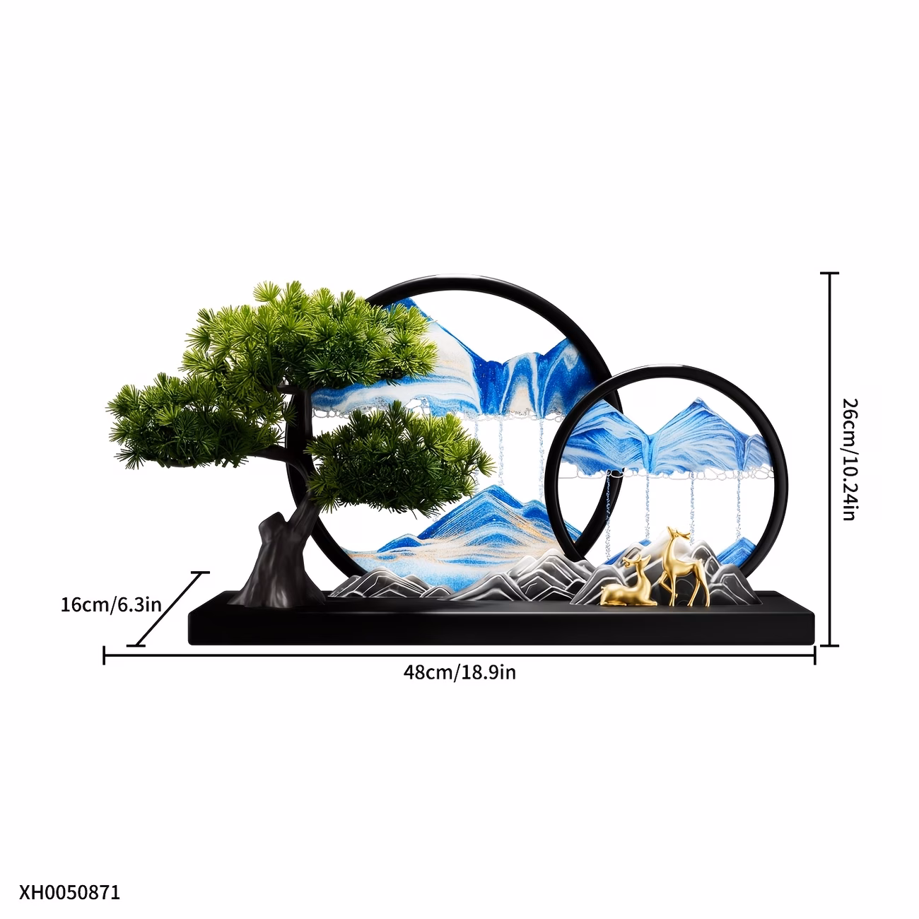 لوحة رملية مزدوجة التدفق هي قطعة ديكور فنية راقية تجمع بين الجمال البصري والهدوء النفسي، مصممة خصيصًا لمحبي الذوق الرفيع والديكور العصري المستوحى من الطراز الصيني الجديد.
