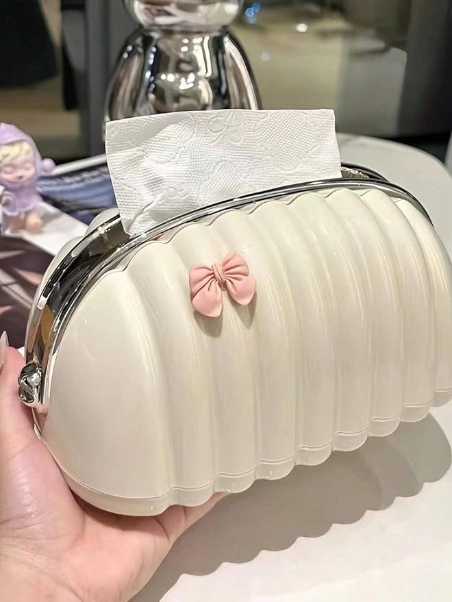 علبة مناديل أنيقة بتصميم مضلع مع فيونكة ومقبض فضي، عملية وديكور في نفس الوقت، مناسبة لغرف المعيشة والمكاتب والحمامات،